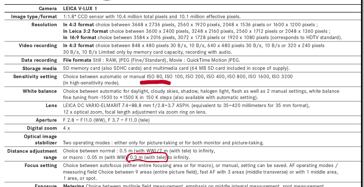 - Le Leica V-LUX 1 démarre à 100 ISO comme le FZ50. Une erreur dans la documentation technique de Leica indiquait qu'il démarrait à 80 ISO, en réalité il n'en est rien.